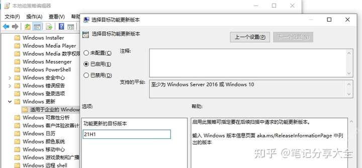 3、双击“选择目标功能更新版本”,点击“已启用”输入“21H1”确定,重启之后就不会收到Win11推送了。